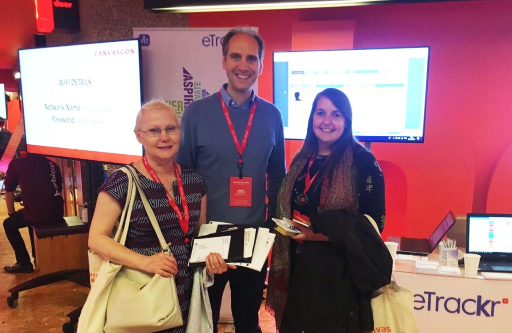 Photo: Our MD Mark with two very happy eTrackr-ILP and eNotify customers at CanvasCon: Grace and Fiona from Lakes College.