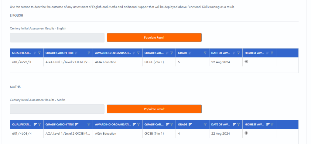 The integration with CENTURY allows initial and diagnostic assessment results to be viewed within the learner ILP Page on eTrackr.