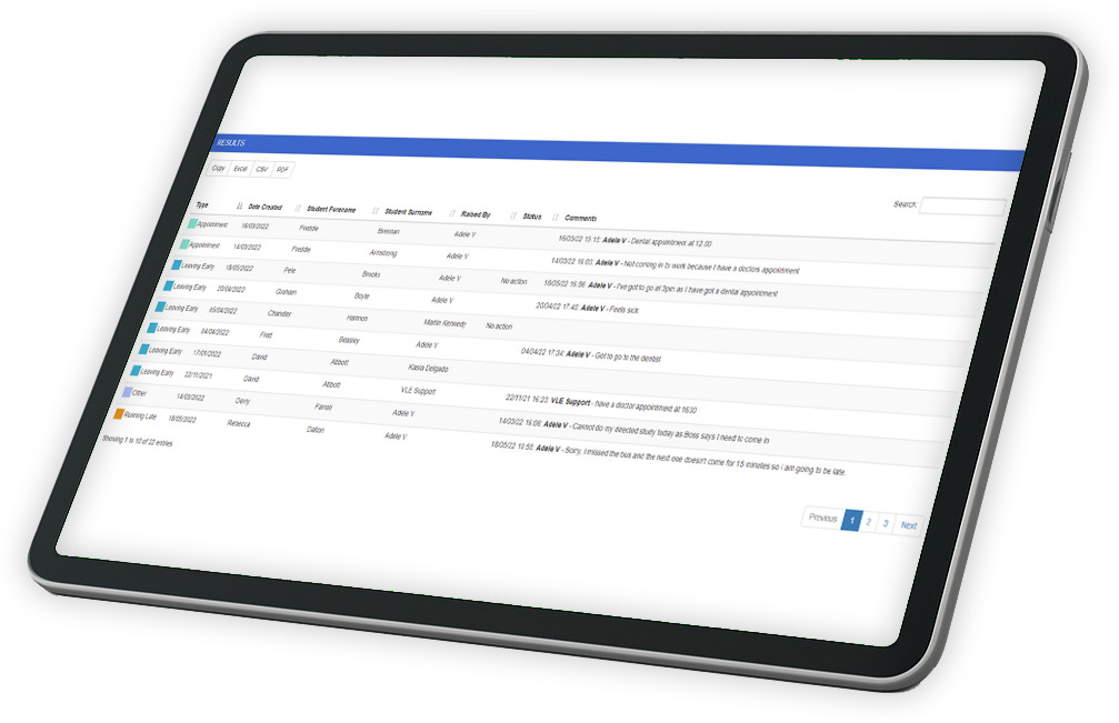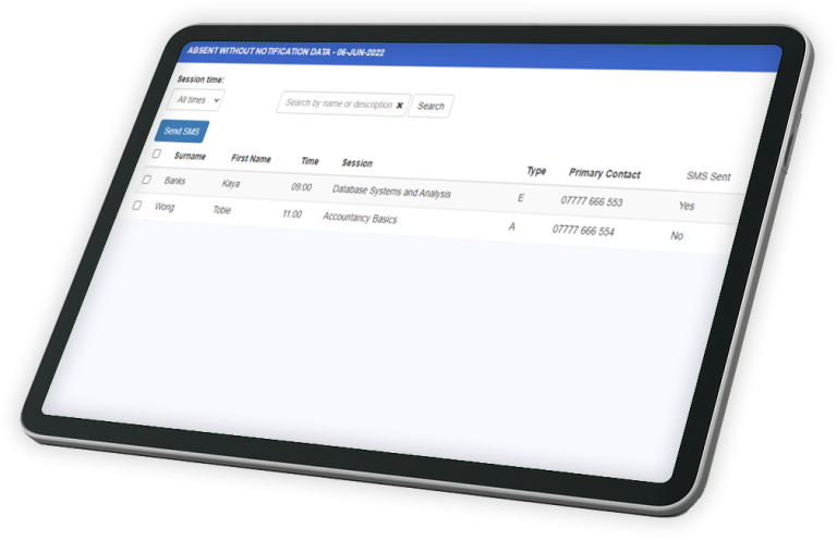 A web-based notification system with a mobile app, to enable students to tell the college they are unwell or not in college for another reason.  The system automatically and immediately notifies relevant staff of the student’s absence, and also keeps detailed statistics to identify patterns, put in place support measures and address safeguarding concerns.